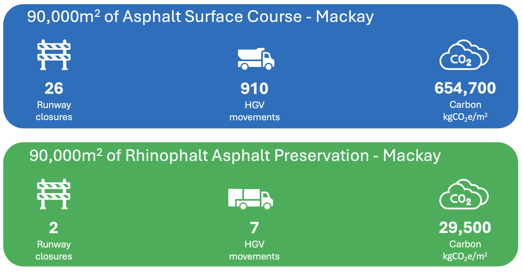 Compared to asphalt resurfacing of RWY14/32, the main benefit to Mackay Airport’s use of RHiNOPHALT included the 90% reduction in cost and time savings.