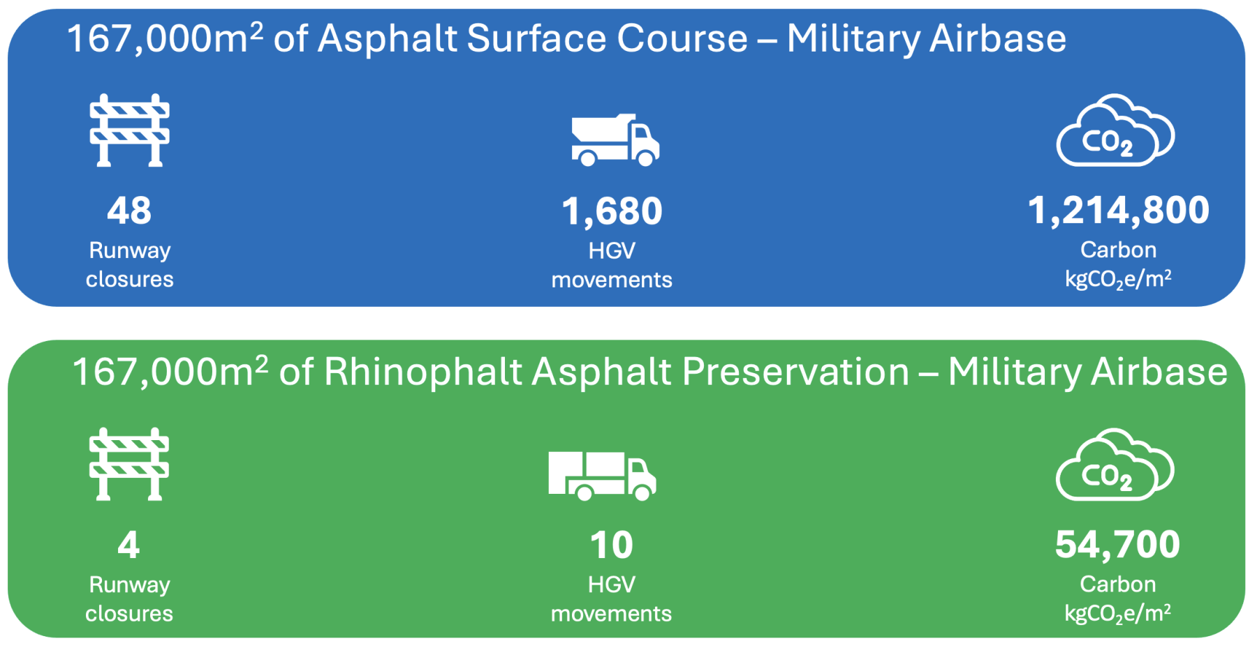 ASI’s Rhinophalt® asphalt preservation on runways, taxiways, aprons and access roads provides a recognised maintenance solution to airport asset managers. Rhinophalt® extends the operational life of the asphalt surface. Rhinophalt® helps meet airport operators’ sustainability aims because it can deliver more than 90% in carbon savings compared to resurfacing. The technique allows more of the original aggregates in the asphalt to remain in place and to be protecting meaning that resurfacing (which puts new aggregates in) doesn’t have to be done so often.